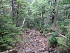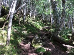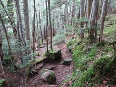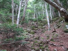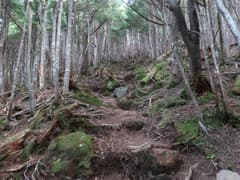 木の間から小真名子山をチラ見すると、道は急斜面の下りとなり、苔が下生えの針葉樹林の中、鞍部に向かってドンドン下る。向かいの小真名子山は、見る見る高くなって、あれを登るのかと思うとがっくし来る。