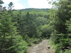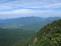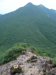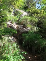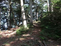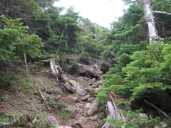 古い鎖が張り流された坂を登ると、なだらかな稜線上に着く。ここで一休み。樹林の間から吹き上がって来る風が涼しくて気持ち良く、下界の酷暑を忘れる。