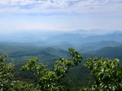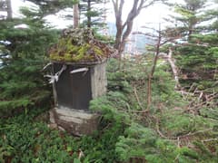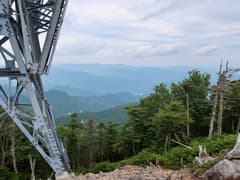 稜線を覆う樹林が低くなって来て、梢越しに日光市街や足尾山地の低山を俯瞰する。下界はもわっとした靄に包まれて、見るからに暑そう。やがて、木の祠が見えて来て、大真名子山の頂上に登り着く。