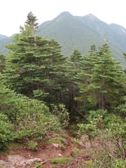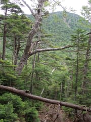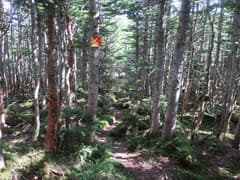 この先、笹はなさそうなので、下ゴアを脱いでから進む。すぐにコメツガ等の針葉樹林に覆われた急斜面に取り付き、ほぼ一直線に登ってグングン高度を上げる。途中、凄い速さで登る若者二人組に追い越される。今日は何故か若いハイカーさんばかりに遭うな。
