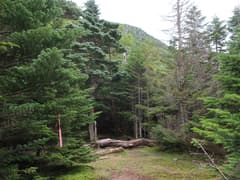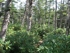 休憩して展望を楽しんだのち、小真名子山に向かう。針葉樹林の中を緩く下ると、シャクナゲも現れる。