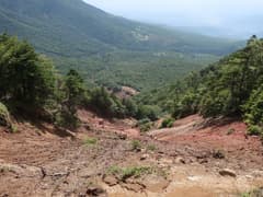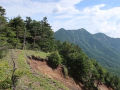 程なく右斜面が崩壊した薙の上端に出て、帝釈山から女峰山にかけての稜線が良く眺められる。薙を見おろすと、赤土が露出し、雨裂が走る急斜面が遥か下まで続いていて、崩壊っぷりが凄まじい。