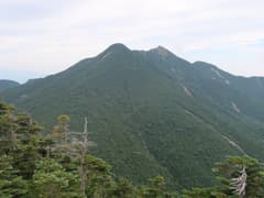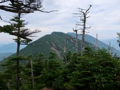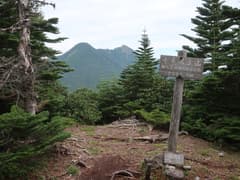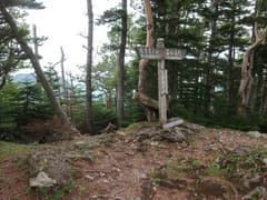 水を飲んで休憩したのち、小真名子山への登りに取り付く。大真名子山からの下りと同じ様な、針葉樹林に覆われた急斜面を直登する。ようやく傾斜が緩み、なだらかな稜線上に登り着く。あとは稜線をひと登りして、小真名子山の頂上に着く。