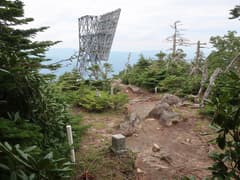 昼食を終えて歩き出すと、すぐに樹林を抜けて開けた緩斜面に出て、ここに三角点標石と電波反射板がある。なんだ、こっちで休憩すれば良かった。西には日光白根山と太郎山を望み、東には帝釈山と女峰山がさっきより良く見える。北には鬼怒川源流域の山並みが広がり、その中に川俣湖の湖面が鈍く光っている。