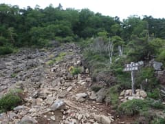 ここから樹林に入って下ると、ガレ場の上端に出る。正面にスックと聳える帝釈山を眺めながらガレ場を下る。傾斜が急な上に足元が不安定で、慎重に下る。さらに、左右に振り分けられたガレ場の間の、樹林が残った尾根を下る。