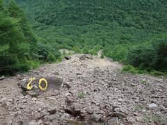 脆くてガラガラの踏み跡を下る。途中、トラロープが張られている。樹林とガレ場の間を出たり入ったりして下ると、最後に長いガレ場に出る。目印の黄色ペイントの丸が描かれた岩がほぼ一直線上に点々と遥か下まで続いている。これはなかなか壮観。