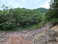 数回、大きくジグザグを切って下る。カーブミラーが設置され、舗装された区間もあるが荒廃している。やがて、ガレて崩壊が激しい沢を横断する。この沢は、大真名子山の頂上の先で上端を通過した薙の下流らしい。この辺りまで重機が入った跡があり、何やら工事中の模様。少し下ったところに現場事務所のプレハブが建ち、看板に「R4大真名子東沢砂防堰堤工事」と書いてある。工期はR6年11月末まで。