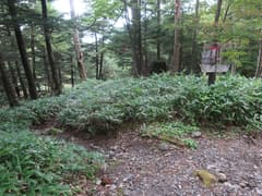 大真名子山から標高を約250mも失って、「鷹の巣」と称する鞍部に下り着く。道標あり。辺り一帯は鬱蒼とした樹林に覆われているが、ここだけぽっかりと明るく開け、行く手には小真名子山、振り返れば大真名子山ののっそりと高い山容を仰ぐ。