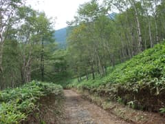 右の志津林道を辿ると緩い登りとなり、陽が差して暑いこともあり、少々しんどい。閉鎖されたゲートを過ぎ、ダケカンバとササに覆われた山腹をトラバースする。にわかに上空に灰色の雲が広がり、少し涼しくなって助かる。ポツポツと雨粒が落ちて来たが、すぐに止やみ、志津乗越に着く。