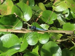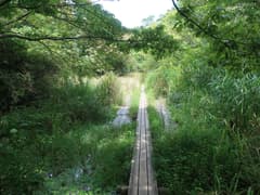 センターから小道に入る。案内図によると自然観察の森の中には4つのトレイルがあり、その中の「コナラの道」を辿る。「モンキチョウの広場」という原っぱを通り、樹林に覆われた斜面をトラバースする。すぐに「ヘイケボタルの湿地」というごく小さな湿原があり、中を木道が通っている。