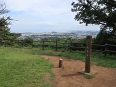 急な階段をえっちらおっちら登って、大丸山の頂上に着く。頂上は草地の広場で、三角点標石や「横浜市最高峰 大丸山」という山名標識、ベンチがある。東側が開けて金沢区の中心市街や海の展望が良く、ハイキングのランチにピッタリの頂だ。今日は昼食は持参していないし、S&Sをお待たせしているので、冷たいお茶を飲んで一息入れたのち引き返す。