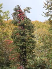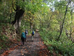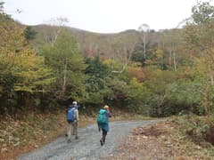 冨士見山荘跡までは未舗装の林道歩きとなる。このルートは、以前、残雪期にテレマークで往復したことがある(山行記録)が、雪がない季節に歩くのは初めて。山腹をつづら折りに登り、大行山(だいぎょうさん)中腹の広い平坦地を進む。この辺りの樹林は黄色や赤に色付いて綺麗だ。