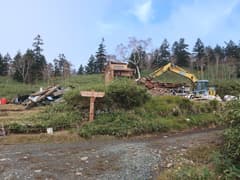 最後に小さくジグザグを切って登ると、冨士見小屋の跡地に着く。小屋は取り壊し中で、油圧ショベルが壁を突き崩し、瓦礫の山を築いている。後日調べると、2015年の営業終了後に閉館したらしい。小屋の前のWC(チップ制)は使用可能である。
