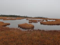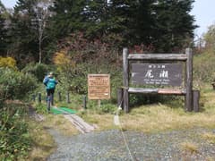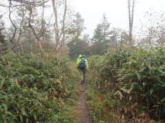 アヤメ平に来たのは2005年の秋以来(山行記録)。そのときは湿原の植生復元作業中で、人為的な痕跡が残っていたが、十数年が経過して、自然な感じに戻ったような気がする。薄らと至仏山が見えていたが、写真を撮ろうとしたらガスに覆われてあっという間に見えなくなり、寒風が吹き付けて来た。山の天気は変わりやすい。Tmさんは来週、尾瀬でキャンプをするそうで、こんなに寒いとは、とビックリして居られる。