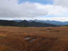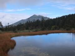 冨士見小屋跡からアヤメ平への道に入ると、行き交うハイカーさんが急に増える。樹林を抜け、狐色の草原を渡ると、富士見田代の池塘が現れる。満々と水をたたえ、その向こうに雲を纏う燧ヶ岳を望む。しばらく待っていると雲が流れ去って、柴安嵓、俎嵓の双児峰が姿を現した。これは良い眺めだなあ。皆、写真を何枚も撮る。