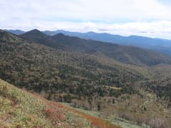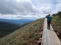 富士見田代で尾瀬ヶ原に下る長沢新道を分け、台地状の稜線の縁に沿って登る。新しい木道が整備され、急な区間には滑り止めのゴムネットが張り付けられて、歩き易い。左側は笹原の斜面となり、展望が開ける。眼下には富士見下から登って来た谷がゆったりと広がり、白尾山や荷鞍山、その奥には日光白根山や錫ヶ岳を遠望する。