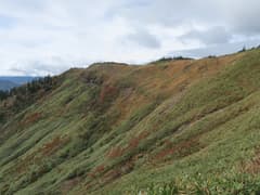 やがて、アヤメ平の笹原に覆われた稜線が見えてくる。この辺り、積雪期には稜線の雪庇から雪のブロックが落ちてくる場所なので、急いで通過した記憶がある。今の時期は、そんな危険は微塵もなく、稜線を見上げてのんびり歩く。
