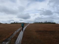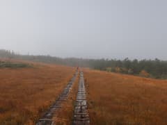 この先はゆるやかなアップダウンのあと、横田代へ緩い下りとなる。この辺の木道は老朽化したままで、湿った木の表面は非常に滑り易い。2回滑って転けたが、事なきを得る。やがて、横田代の上端に着いて、緩斜面に広がる草原を見渡す。晴れていれば至仏山が見えるはずだが、ますますガスが濃くなって、晴れる気配はない。ここで引き返す。