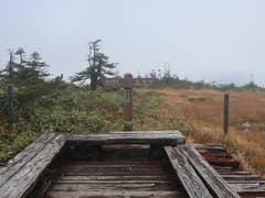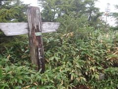 展望もきかなくなったので、この先どうしようかと相談し、まあでも横田代までは行ってみよう、と決まる。草原から樹林に入ってしばらく進むと、木道の脇に三角点標石と「中原山」と記された道標がある。ここが中原山の頂上だが、広く真っ平らで笹と樹林に覆われて、およそ山頂らしくない。