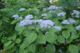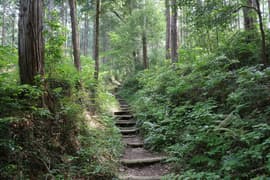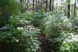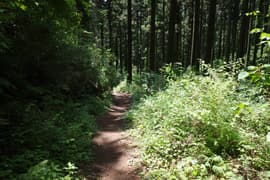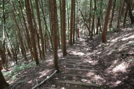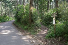 南駐車場から車道を上ると、すぐに斜め右へ杉林に分け入る山道があり、これを辿る。道端に大きな石碑や石鳥居があるから、古からの参道だろう。左手には並行して車道が通じている。林間にはコアジサイの群落が瑞々しい葉っぱを繁らせ、薄紫の花が見頃で、なかなか良い雰囲気。久し振りの山歩きはやはり気分が良いなあ。ゆるゆると登る。