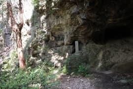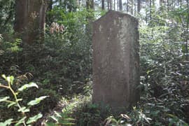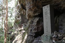 瀧神社から右手へ、ゴツゴツした岩壁を見上げつつ御嶽山に向かう。杉林に覆われた水流のない谷間に入り、転石を踏んで坂道を登る。小さくジグザグを切って登って行くと、左手に再び岩壁が現れる。岩壁の基部に沿って踏み跡を登ると、小岩窟に「記念 中興開山米山治平翁之碑」の石碑が建つ。側面には「明治四十三(1910)年三月發見 大正六年一月宇都宮三寶講建立」の銘がある。ここがアルマヤ堂らしい(少し先に標識がある)。アルマヤと言えば、木曽御嶽山に登った際、そんな名前のピークを踏んだことがある。