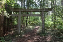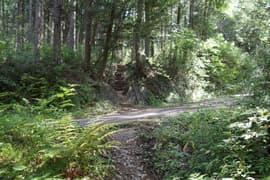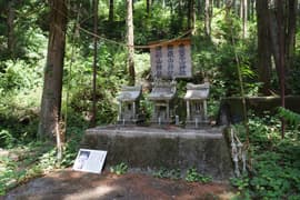 さらに下ると車道終点の広場に出る。ここも駐車可能かな。車はない。ここには古賀志神社、御嶽山神社、湯殿山神社の3基の新しいめの石祠が合祀されている。傍に「古賀志温泉(鉱泉)」の説明板がある。それによると石祠の裏手が温泉跡で、鉄分の多い鉱泉を引き、明治の一時期、二階建ての湯屋で営業していた、とのこと。