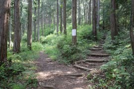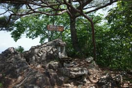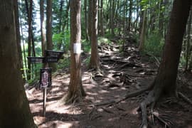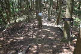 少し休憩したのち、古賀志山に向かう。巻道ではなく、稜線上の縦走路を進むと、鎖を手摺にした岩場のトラバースがある。ま、大したことはない。岩場を抜けると右に南登山道を分ける。この分岐の道標には南登山道の他、猪落(ししおとし)や古賀志山大神〜対面岩のコースの案内があり、興味を惹かれる。