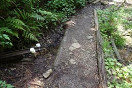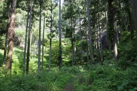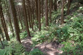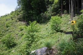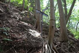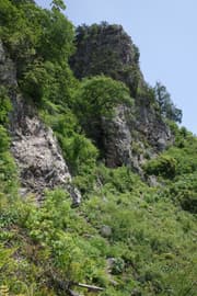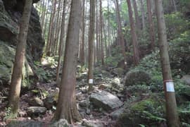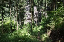 岩壁が眺められるトラバース道の区間は短く、程なく杉林に入る。しかし、面白かったな。猪落と対面岩コースは機会を作って歩きたい。杉林に覆われた山腹を巻いて行くと、木立を透かして男瀧周辺の岩壁が見えてくる。瀧神社には立ち寄らず、沢沿いの道を下る。途中、水場がある。暑くて喉が渇いてきたところだったで、丁度良い所にあった。