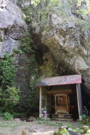 谷間の広場を囲むように岩壁が聳え、半洞窟の中、覆屋の屋根の下に大きな朱塗りの社が祀られている。これが瀧神社だ。左脇のオーバーハングした岩壁の上から、細々と水が落ちている。水量はないが高く威圧的で、見応えがある。左方の岩壁ではロッククライミング中。広場ではちょいワル系二人組おやじさんが休憩中で、彼らもクライマーのようだ。瀧神社の説明板によると、天仁元(1108)年に日光山瀧尾権現を勧請したのが始まり(諸説あり)で、明治の神仏分離令で瀧大権現から瀧神社に改められた、とのことである。