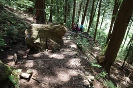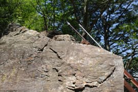 途中、登山道の真ん中に大岩が鎮座ましましている。これは事前に調べたネット情報(古賀志山を守ろう会のお知らせ)によると2018年12月に発生した落石で、このGW中にも同じ場所で落石があったらしい。このすぐ先で年配の方のグループがのんびり休憩中😨…