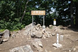 アルマヤ堂からひと登りで、御嶽山〜古賀志山の縦走路の巻道に合流する。まずは縦走路を左(西)へ、御嶽山に向かう。小さな岩場を鉄梯子で越えると、数組のハイカーさんが憩う御嶽山の頂上に着く。
