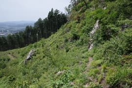 さらに下ると広大な伐採跡地の斜面に出て、山麓の展望が開ける。歩く予定の古賀志林道も俯瞰できるが、単調で暑そう。道標があり、右へ岩下道が分岐する。その名の通り、南面の岩壁を間近に仰ぎながら伐採地をトラバースする道で、こっちの方が面白そうだ。