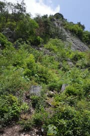 猪落の岩壁の下を回ると、右のルンゼへ登る踏み跡が分岐する。分岐から少し登ってみると鎖が設置されている。これが対面岩コースらしい。トラバース道に戻って進む。見上げる岩壁の上が古賀志山大神のピークだろうか。振り返ると、猪落の岩峰が聳り立つ。低山の岩場なのでスケールは小さいが、実に険しくて侮れない。
