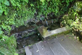 駅は無人。駅前の広いロータリーの真ん中には、ポツンと小さな櫓が建っている(後日調べると、盆踊りが催されるそうだ)。芝草山登山口までは、車道を2.6km歩く。駅前からR121に出て右折。車両の通行は疎らで、幹線道路にしては寂しい。陽射しだけがジリジリと照りつけ、これはもう真夏並みの天気だ。男鹿川に架かる旧道の橋(通行止)の袂に「上の清水」の看板を見かけて、立ち寄ってみる。古来、会津西街道を行き来する旅人の喉を潤した水場とのことで、石垣の下から清水がバンバン湧いている。一口飲むと冷たくてうまい。この先の「三依小中学校入口」の案内標識でR121から左折。しばらく、芝草山を正面に仰ぎながら集落の間を歩く。