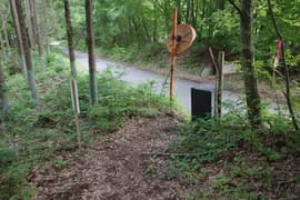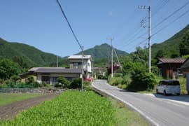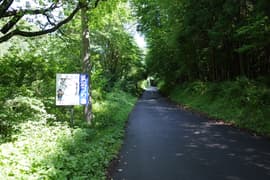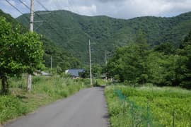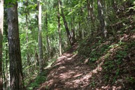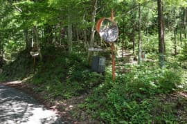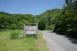 車道に戻って、渓流沿いに歩く。木陰が多くなり、涼しく歩ける。大山祇神社の草深い参道入口を過ぎる。ちょくちょく「三依渓流釣り場」の案内看板があり、残りの距離が表示されている。芝草山登山口は釣り場のすぐ手前だから、あと少しだ。