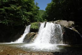 三依小中学校の入口を過ぎると民家もほとんど尽きて、山間に入る。左手を流れる渓流からドドドという水音が聞こえてくる。路側に駐車スペースがあり、どんどん滝との標識がある。滝があるなら、立ち寄って行こう。山道を下って僅かで河原に降り立つと、すぐ上流にどんどん滝がある。落差5m位の幅広の滝だ。滝上に取水堰が見えているのはイマイチだが、水量が多く、水飛沫で涼が得られるのは良い。