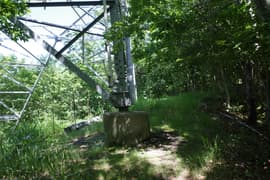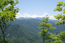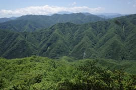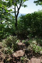 頂上で小一時間休憩したのち、往路を戻って下山する。下りは楽でサクサク進む。大岩を注意して通過。標高が下がるに連れて次第に気温が上がり、送電鉄塔に着く頃にはすっかり下界の暑さに戻る。休憩して水を飲み、さらにジグザグを切って登山口に下り着く。