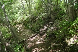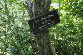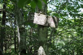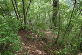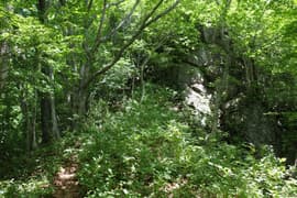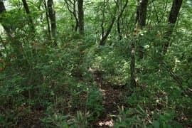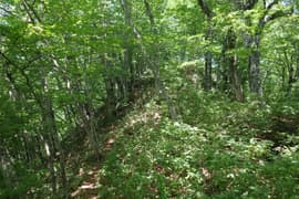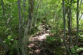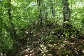 大岩からはゆるゆると尾根を登る。ブナが混じる自然林に覆われ、標高も上がって涼しい風が尾根を吹き渡り、気持ち良い登りが続く。最後は急坂となり、三角点標石のある芝草山の頂上に登り着く。