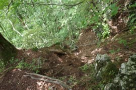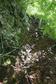 小さな上下もある尾根を登って行くと、やがて正面に岩壁が現れる。これが地形図に記載のある「大岩」だな。岩壁の基部を左へ進み、切り返して右に登ると太い固定ロープが張られた急坂が現れる。ちょっと高度感があるが、しっかりした木の根の手掛かりが続くので、難しさはない。