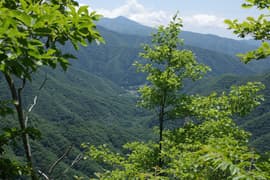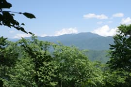 大岩の上に出ると、木の間から展望のある場所がいくつかあり、日光方面や高原山を遠望する。振り返って中三依集落を俯瞰する場所もあり、結構登って来たな、と実感する。駅から芝草山を見上げたときより、上から見下ろす方が標高差が大きく感じられる。