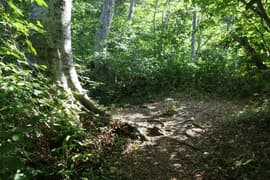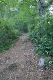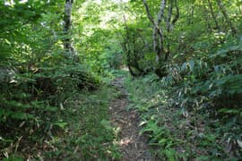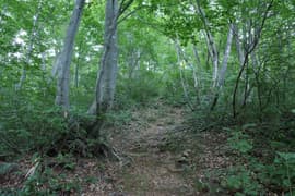 見晴しの良い尾根道から、ブナ林の緑陰に入ると四合に着く。一休みしてじっとしていれば、風が通って涼める。