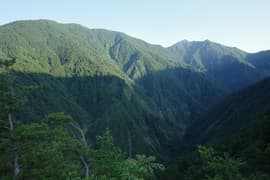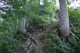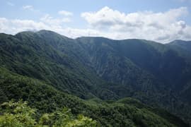 パンとペットボトル飲料で朝食を済ませ、登山センターのWCを借りて出発。コンクリート法面の階段をジグザグに登って尾根の末端に取り付き、ブナ林に覆われた尾根道を一直線状に急登する。蜘蛛の巣によくひっかかるので、今日のこのコースでは私が先頭らしい。最近、雨が降っていないのか、路面の赤土はひび割れ、落ち葉はカラッカラに乾いている。前回はトレーニングのつもりでペースをあげてガシガシ登ったが、今回、それをやるのはちょっと無理。ゆっくり登る。尾根上は木陰で風が通り、涼しくて助かる。