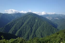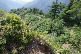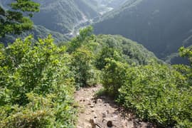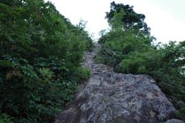 標高が下がるに連れて気温が上がり、段々暑さが応えて来る。往路で吹いていた風もピタリと止まった。四合までは樹林に覆われて陽射しが凌げるが、三合から二合にかけての見晴しの良い尾根は炎天下の歩きとなる。岩場の鎖や岩もチンチンに熱せられて、摑んでいられない。腕や首筋が日焼けしてヒリヒリ痛い。日焼け止めを持って来るべきだった。