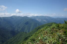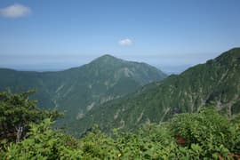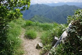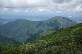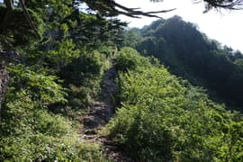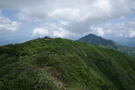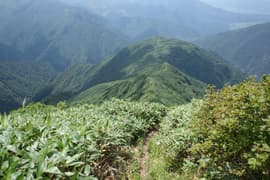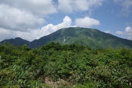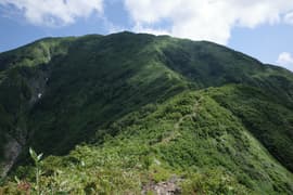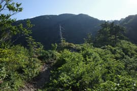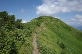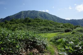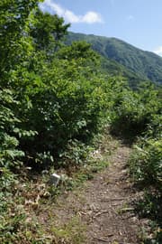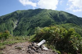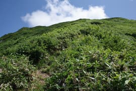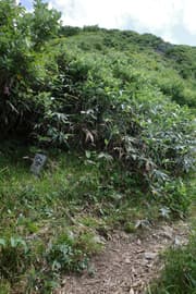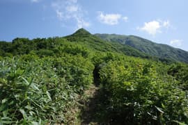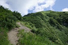 七合から頂上稜線に向かって急登する。斜面の途中の道端、笹が覆いかぶさるところに八合の標石がある。右斜面の谷底(コウガイ沢)を見おろすと雪渓があり、吹き上がってくる風が涼しい。笹原の急斜面を登って、ようやく九合の標石がある稜線の上に着く。稜線の向こう側の斜面には草原が広がり、ちょんと尖った頂きの荒沢岳が眺められる。