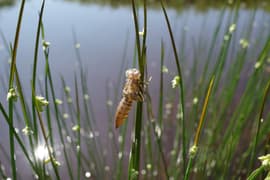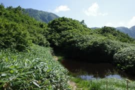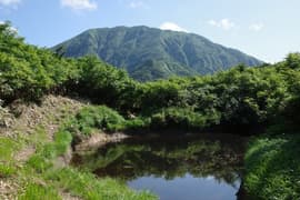 五合から広くてなだらかな起伏の尾根となり、生姜畑と呼ばれる池や草原が点々と続く。前回はこの辺は厚い残雪に覆われていて、池は見ていない。こんなところだったんだなあ。池の周辺には赤トンボが群舞し、水辺の草にはヤゴの抜け殻がしがみついている。池の水は褐色に濁り、中には大きなオタマジャクシがうようよ。水温が高くて、ぐったりしているように見える。雨が降らないと水が干上がりそうで心配だ。