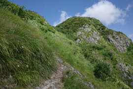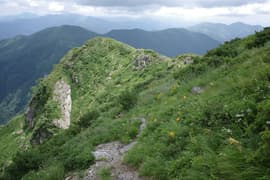 高山的な雰囲気のある稜線を辿って中ノ岳に向かう。稜線直下の草付き斜面をトラバースする区間では野山の花が咲いているが、接写しようしてザックを背負ったまま屈むと疲れる。写真は帰りに撮ろう。意外と登りがあり、九合から25分程かかって中ノ岳頂上に着く。疲れたー、やっと着いた。