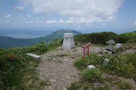 頂上は360°の展望が開ける小平地で、小さな鳥居と石祠、三角点標石、展望盤がある。小さなベンチもあり、それに腰掛けて大休止。まずはさば味噌煮をつまみに缶ビールを開ける。🍺うめー。それから、あまり食欲はないが、カップヌードルカレーを食べて、エネルギーを補給する。ここまでハイカーさんには一人も合わなかったが、九合の方からソロハイカーさんが到着。丹後山経由で来たのかな。