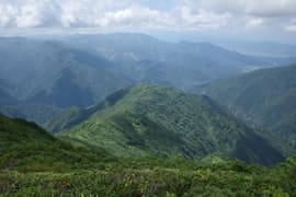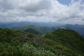 昼食後、頂上からの展望をじっくり楽しむ。東から南にかけては、荒沢岳、兎岳、丹後山と山並みが続く。南西には登ってきた日向山の尾根を俯瞰する。いやー、よく登ってきたもんだ。西から北にかけては八海山、越後駒ヶ岳を望む。また、頂上の北の稜線上には中ノ岳避難小屋が見える。