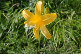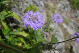 頂上でゆっくり休憩したのち、往路を戻って下山にかかる。頂上稜線には花が多く、写真を撮りながら下る。マツムシソウは早くも秋の気配を感じさせ、ニッコウキスゲのぽってりと大きくて黄色い花が目を引く。
