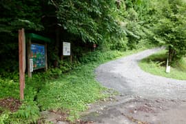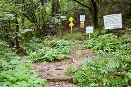 登山口から未舗装林道を上るとすぐにWCがある。「野営場」の標識もあるが、そちらは廃止されて久しい感じ。少し先で工石山登山道と三辻山登山道の分岐に着く。三辻山の方には、伐採作業中で危険なため通行禁止、との貼り紙がある。実際、車で来る途中で広大な伐採斜面が見えた。